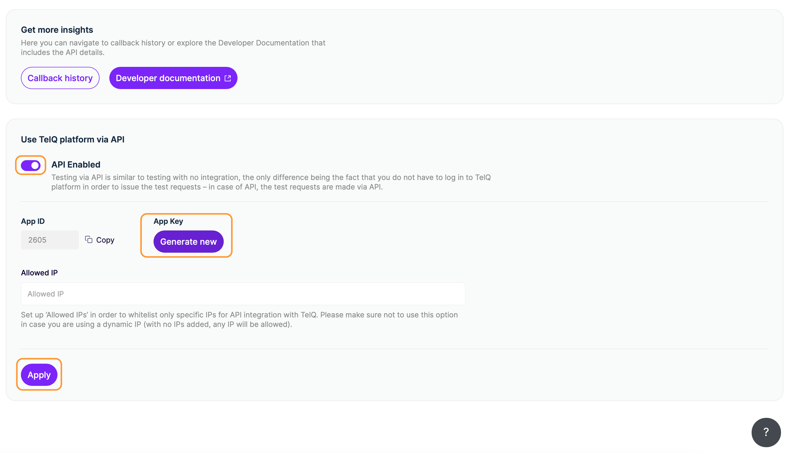 If you would like to use our platform via API, please log in to your TelQ account and go to the Integration Settings > API menu. Click “Enabled” button (unless it is already green), then click on ‘Generate’ next to ‘App key'. Save/copy the App ID and App Key values and then click Apply.