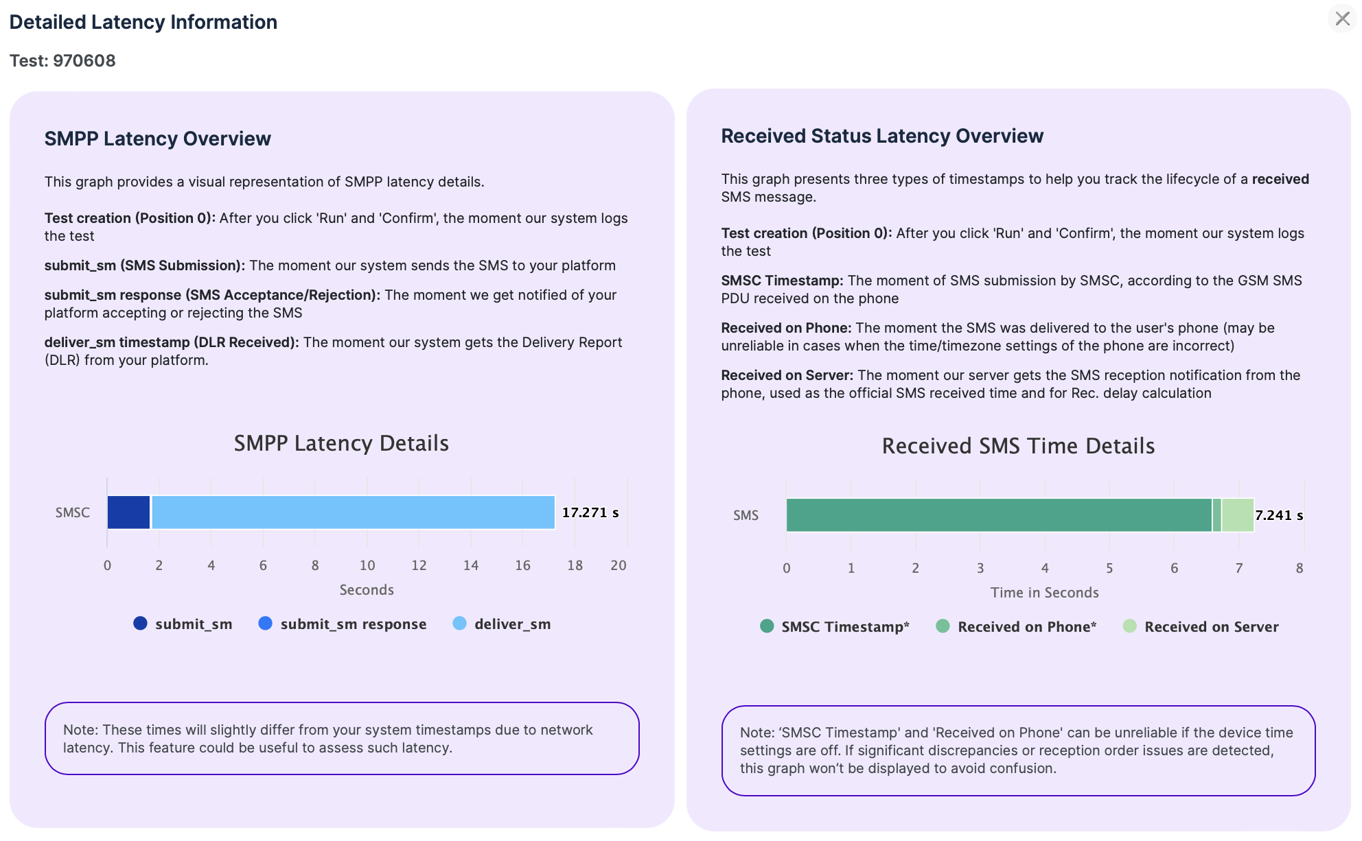 When you click on the values in this column, you’ll see a detailed breakdown of the timestamps involved in sending and receiving the test message. These delays are shown using colored bars and time markers that help you visually understand the flow of the SMS through the system.
