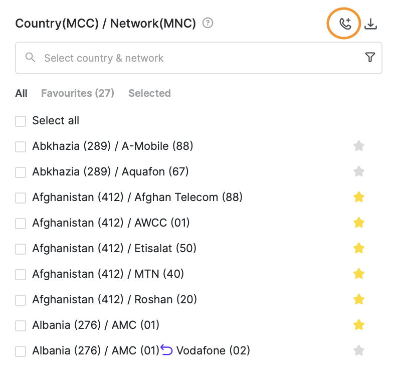 You can search for destinations by by country or network name, or by MCC and MNC codes. Select individual destinations using the checkboxes, or use the Select All checkbox to select all visible entries. Your selections will remain active even after a new search. You can review and manage them in the “Selected” tab.
