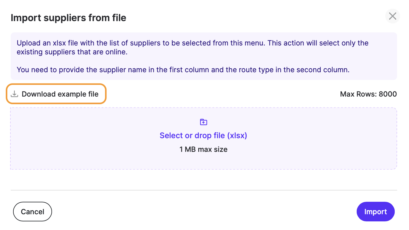 If you need to select multiple suppliers quickly, use the Import from Excel feature. Download the example file, enter your supplier details, and upload it to populate your list automatically. You can download our example file and import the list as shown in the screenshot below: