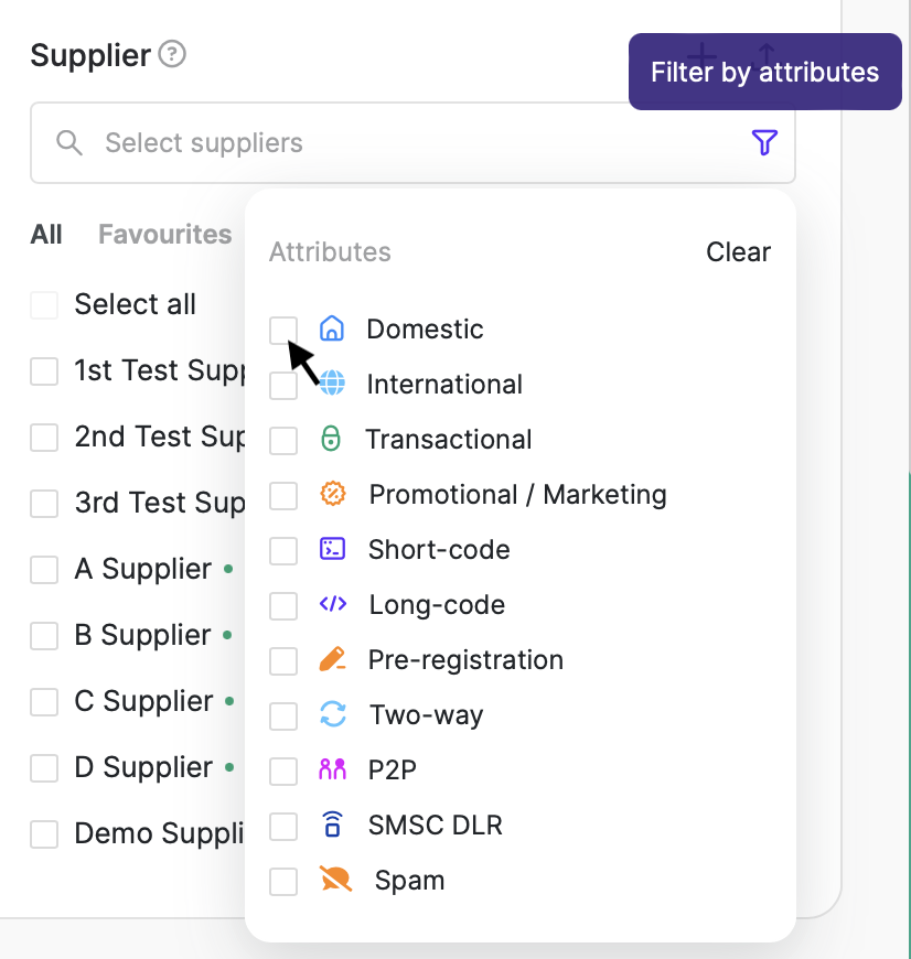 Use the search bar to find suppliers by name, partial name, or route type. To filter suppliers based on their attributes (e.g., Domestic vs International), click the funnel icon and choose the relevant options.