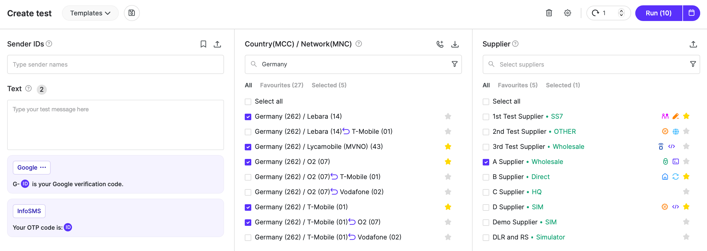 By clicking on the save icon, you can save your input (a combination of Sender ID, Texts, Destinations and Suppliers) as a Test Case Template and reuse it in the future. All the Test Case Templates you create will be available in the “Templates“ dropdown. For more information about templates click here.