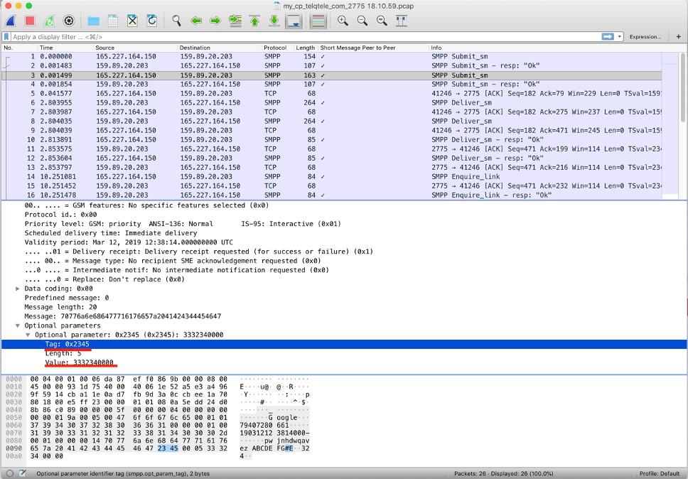 The Tag and Value that you set up in our interface can be found in the optional parameters section of the Submit_sm command of the corresponding test: