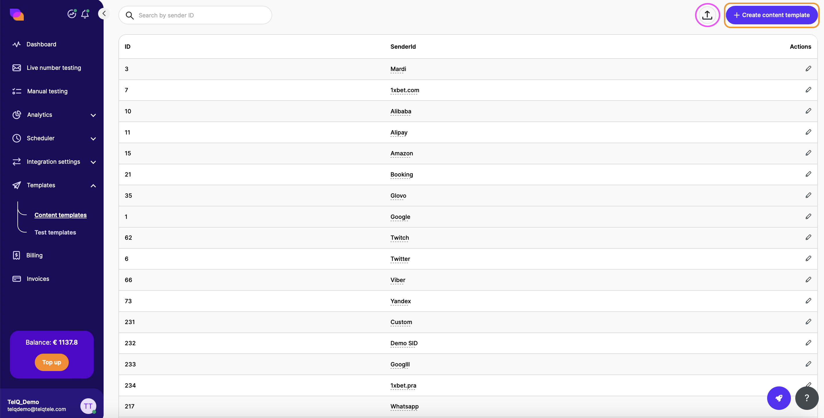 In this section you will see the existing Content templates. By default, your account will have available the most frequently tested content in TelQ Testing Platform. However, you will also have the option to create new templates by pressing on “+ Create content template” or by importing an excel file by pressing on the upload button (as highlighted in the screenshot below):
