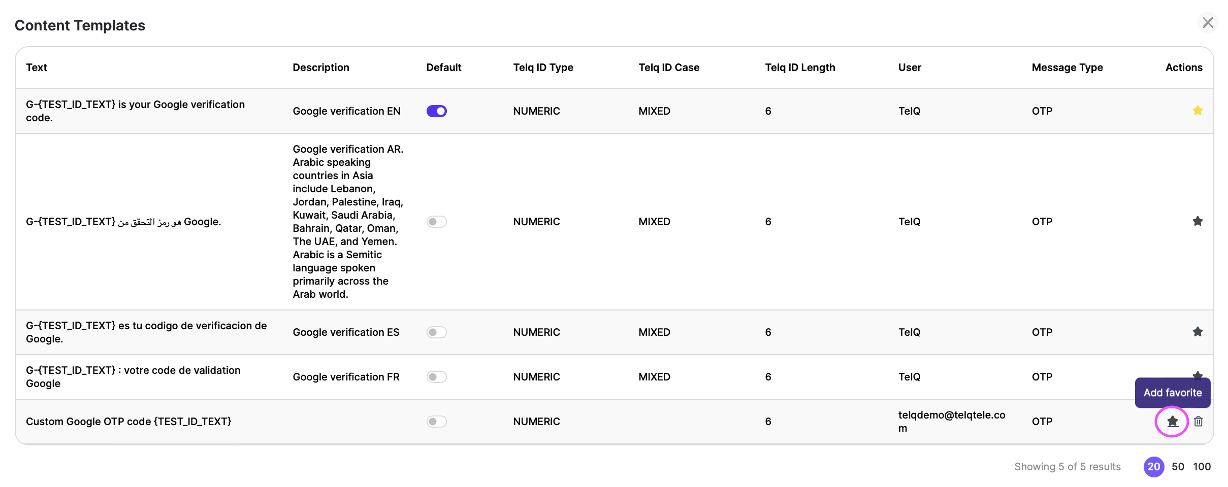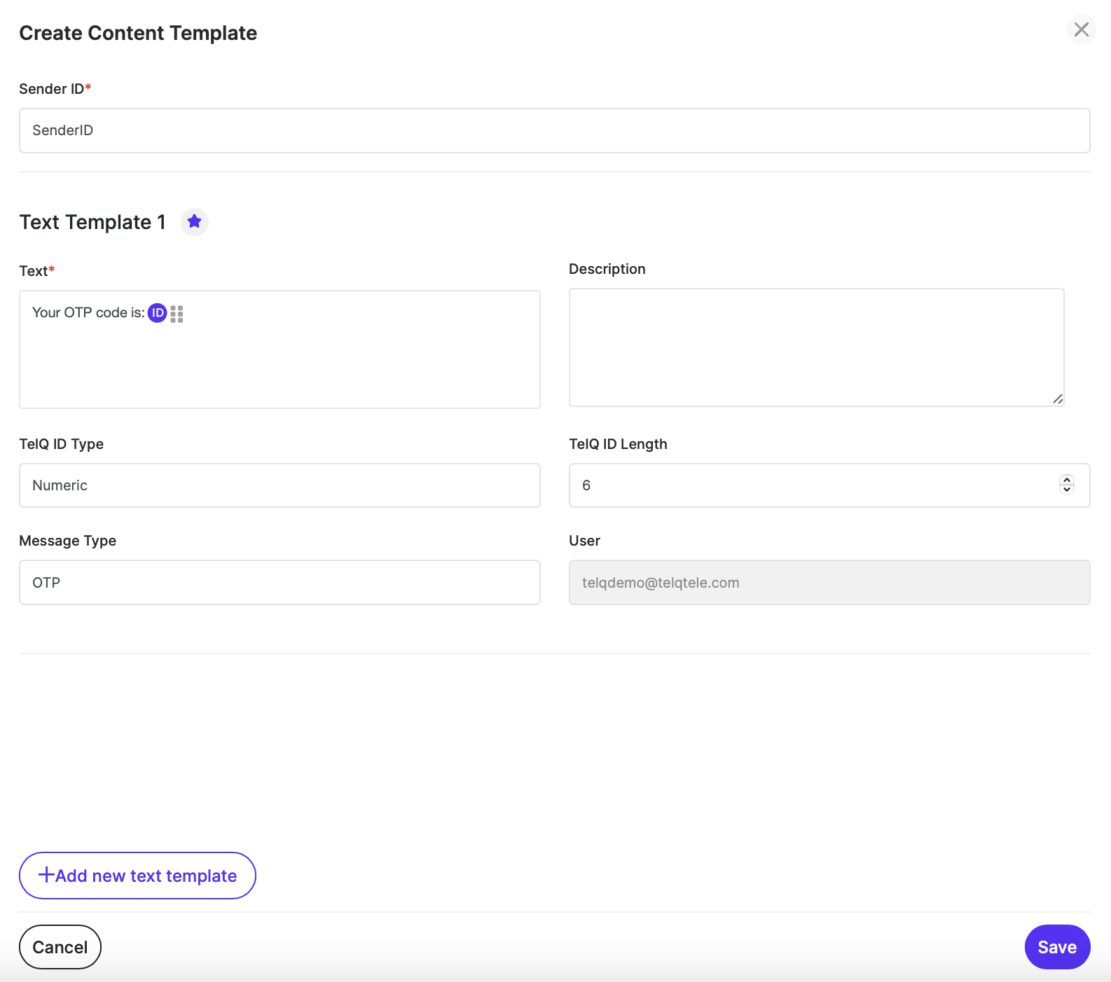 Example: you can have the Sender ID Google and add your content to this SID for multiple languages. To keep adding new text, click on the “Add new text template“ button.