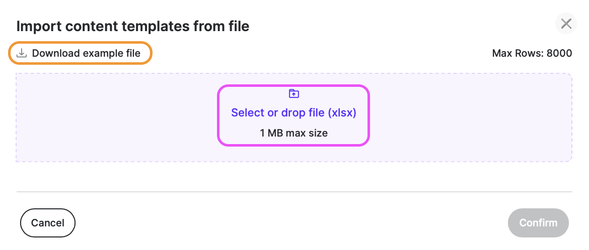 If you decide to import from an excel file, please make sure to download the example file and fill it in with the required details. Then import it by pressing on “Select or drop file (xlsx)” , select the file and then click Confirm.